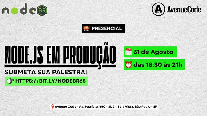 NodeBR em produção [31 de Agosto] - Vai rolar um super evento da comunidade que organizo onde estaremos explorando temas essenciais trabalhados em prática no Node.js. O evento será em São Paulo, cola com a gente!!!!